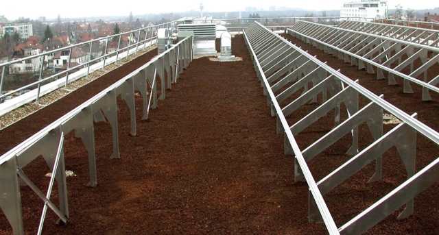 taşıyan çerçevelerin yüksek oluşu nedeniyle solar paneller ve bitki seviyesi arasında güvenilir bir yükseklik oluşmaktadır. Bu bitkinin yeterli gün ışığı ve yağmur suyu almasına ve bakımın kolayca yapılmasına olanak sağlamaktadır. [3] İlk olarak, yeşil çatı katmanları ve panel taşıyıcı çerçeveleri uygulanır. (Resim 3) Daha sonra panellerin montajı ve çatının yeşillendirmesi yapılır. (Resim 4) (Resim 3) [3] , (Resim 4) [5]