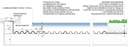 Panellerin güneşe uygun açıda konumlandırılabilmesi için açılı özel çerçevelere oturtulmuştur. Binada kullanılan fotovoltaik panellerin tümü 2. nesil olarak adlandırılan yeni teknoloji ince film panellerdir. İnce film panellerin en önemli özelliği, yaygın ışınımda yani bulutlu havalarda da enerji üretebilmesidir. Panellerin toplam kurulu gücü 13,5 kWp’dır. Paneller yurt binasının enerjisinin büyük bir kısmını karşılayabilecektir. Uygun yasal düzenlemeler yapıldığı takdirde, sistem direk olarak şebekeye bağlanabilir özellikte olduğu için hiçbir ilave önlem alınmadan fazla enerjisini devlete satmaya başlayacaktır. Ayrıca elektrik enerjisini temiz enerjiden karşılamayı seçen binanın karbon salınımı da önemli ölçüde azalacaktır. (Resim 7) [5] Nevşehir H. Avni İncekara Fen Lisesi Yurt Binası’nın çatı alanındaki yeşil çatı ve fotovoltaik panel entegrasyonu uygulamasında, yüklenici ve proje müellifi ile karşılıklı görüşmeler sonucunda, farklı taleplere ve ihtiyaçlara yanıt verebilmek için, anlatılan klasik sistemin ötesinde çözümler ortaya koymamız gerekmiştir. Çatı eğimleri klasik sistemin eğim sınırlarının üzerindedir. Dolayısıyla su sızdırmaz özellikte montaj uygulamasını gerçekleştirebilmek, fotovoltaik panellerin verimliliği için yeterli havalandırmayı ve soğutmayı sağlamak ve iki sistemin birleşiminde estetik görünümü yakalayabilmek için, proje odaklı özel çözümler üretilmiştir. Bunun sonucu olarak, Türkiye’nin ilk yeşil çatı ve fotovoltaik panel entegrasyonu uygulaması, Avrupa’daki uygulamaların da bir adım ötesine geçerek gerçekleştirilmiştir. Ülkemizde çok yeni olan bu tip uygulamalar, her türde konstrüksiyon, form ve kaplama malzemesine sahip çatılarda doğru prensipler çerçevesinde uygulandığı sürece, estetik ve fonksiyonel çözümler elde edilebilmektedir.