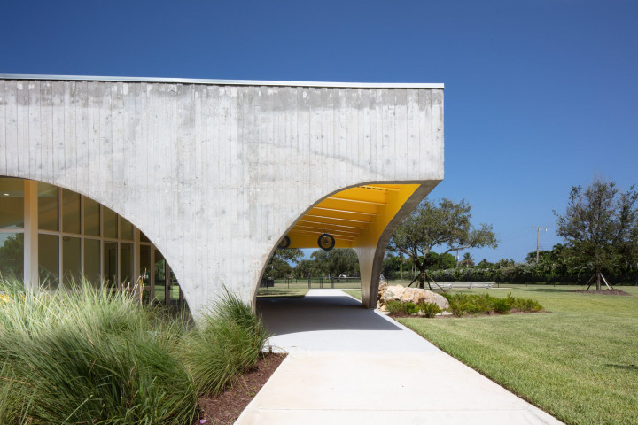 Bina, bölgesel bir bisiklet ağının ve çevredeki ormanlar boyunca uzanan yürüyüş yollarının bir parçasını oluşturan yamuk ve eğimli arazisinin şekline uyacak şekilde tasarlanmış Hap şeklindeki yapı, açıkça görülebilen kamusal bir ön ve lojistik bir arka kısım ile iyi yönlendirilmiş. Ayrıca yan tarafındaki mevcut yarış pistine de bağlanıyor.