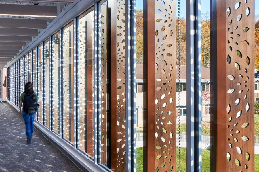 Doğal ışığı filtreleyen zarif paneller, okulun logosundaki yaprak formundan esinlenerek tasarlanmışı Enerji verimliliği sağlamakla birlikte, değişen gölge oyunlarıyla estetik bir deneyim sunuyor.