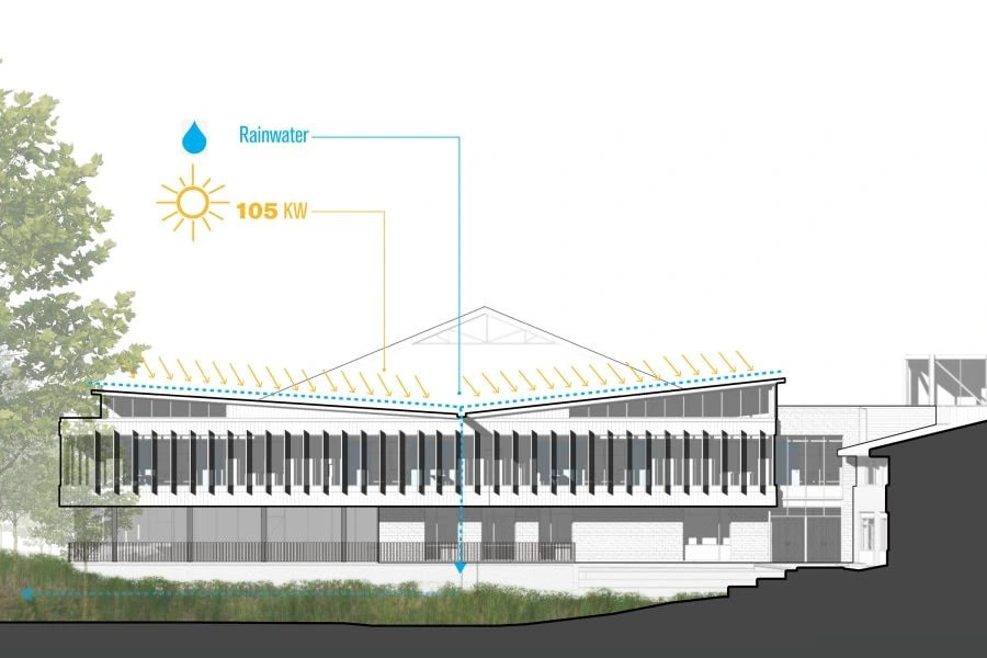 12.500 m2’lik iki katlı yapı, özellikle kelebek çatısıyla öne çıkıyor. Bu çatı, yağmur suyunu ortadaki olukla toplayıp bir biyofiltrasyon sistemine aktarıyor. Scott Walters bu sistemin hem çevresel hem de eğitsel etkisine dikkat çekiyor: