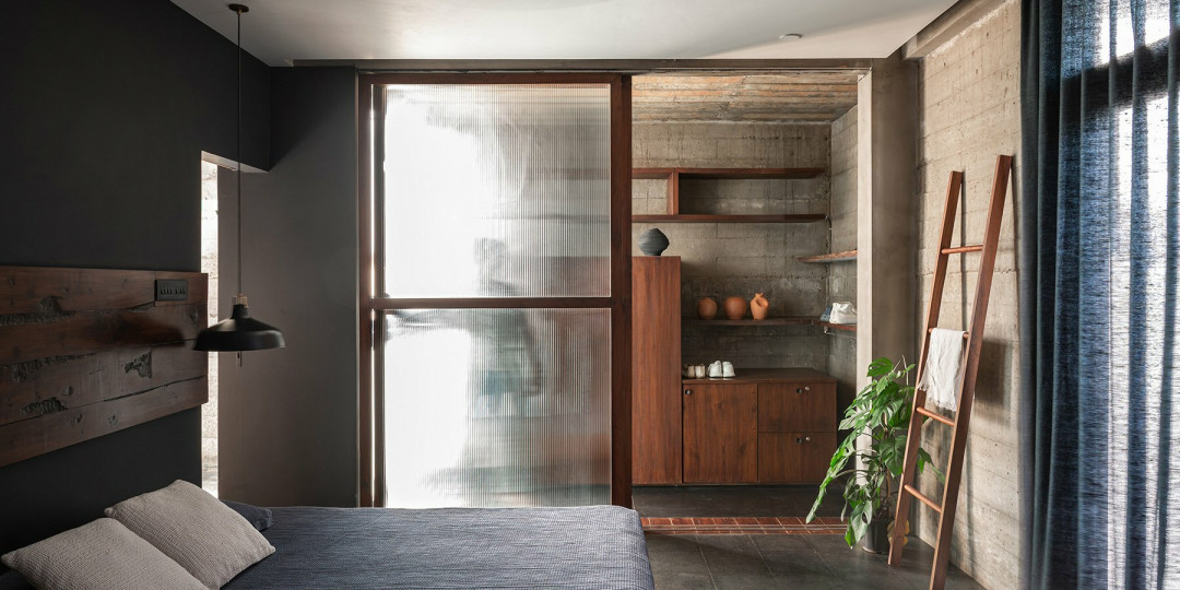 Rahul Pudale Design tarafından tasarlanan rezidans, dış tasarımı yansıtan ve iç ile dış arasında görsel bir bağlantı sağlayan çıplak beton aksanlı iç duvarlara sahip. Brüt beton, pürüzsüz beyaz duvarlar ve sıcak ahşap mobilyalarla kontrast oluşturan modern bir endüstriyel estetik sunuyor. Taş döşeme, toprak tonları ve ince varyasyonlarla rustik bir zarafet sunarken, çimento karolar geometrik desenlerle modern bir dokunuş sunuyor.