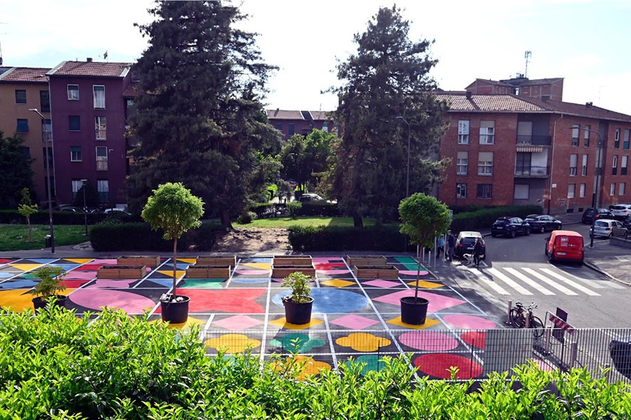 Tasarımcı ve sanat yönetmeni olan Serena Confalonieri öğrenciler ve gönüllülerden oluşan takımı ile birlikte Quadra adlı, Milano Belediyesi tarafından desteklenen Piazza Aperte girişiminin bir parçası olan grafik enstalasyonu yarattı. Kent dönüşümünün bir parçası olarak yapılan grafik sanat projesi Quarto Oggiaro bölgesinde bulunan eski bir otopark alanında bulunuyor.