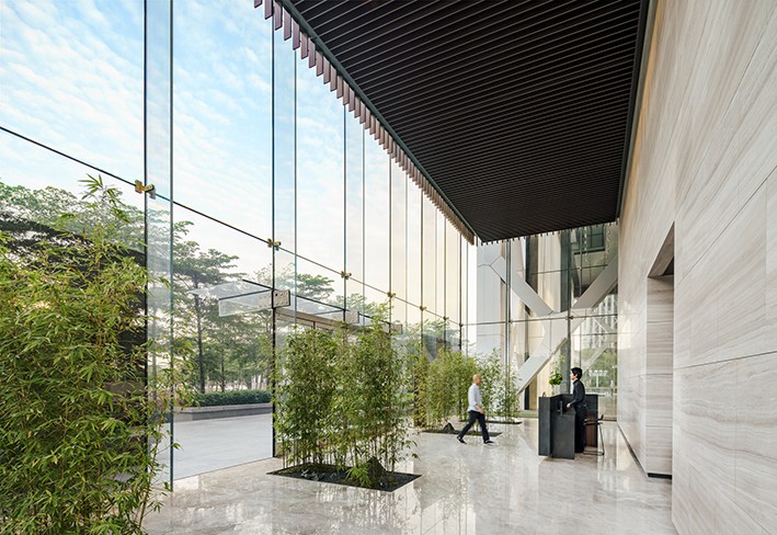 Ortaya çıkan iç alan, optimum gün ışığı seviyelerini korumak için yalnızca otomatik güneş kontrol perdesine sahip basit bir çevre cam duvarla tanımlanıyor. Kulenin cephesi, hem binanın yapısı hem de önemli bir güneş kırıcı eleman olarak hizmet eden bir dış diagrid ile tanımlanıyor. Temelde, diagrid, binadan kısa bir yürüyüş mesafesinde, çevredeki parka ve güney Çin denizine çerçeveli açıklıklar ve manzaralar oluşturmak için genişliyor.