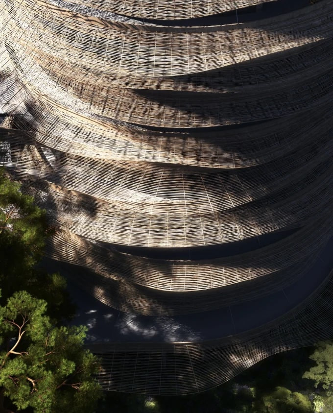 Formları itibarıyla Akdeniz güneşliklerini ya da hasır şapkaları andıran bu bambu örtüler, güneş ışınımını azaltarak yapay soğutma ihtiyacını en aza indiriyor. Böylece yaz aylarında iç mekân sıcaklığını doğal yollarla dengeleyerek, projenin enerji performansını üst seviyeye taşıyor.