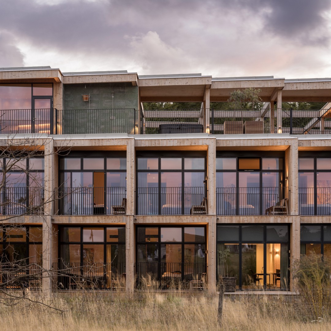 Otelin içi zemin ve birinci katlardaki iki sıra oda arasına sıkıştırılmış doğrusal bir atriyum etrafında düzenlenmiş. Bir merdiven ortasından geçerek en üst kattaki bir terasa ve spaya çıkıyor. Her odanın önünde yer alan korunaklı bir balkon veya teras, zeminden tavana camların doğal olarak gölgelenmesine yardımcı olurken aynı zamanda konuklara özel açık alan sağlar. Odaların içindeki CLT yapısı, kabin benzeri sıcak bir his yaratmak için açıkta bırakılmış.