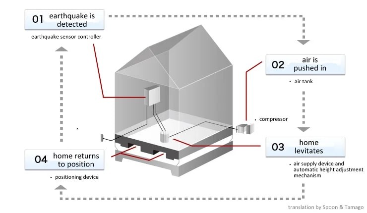 Bir deprem meydana geldiğinde bir sensör bir saniye içinde bir kompresörü çalıştırarak tepki verir, bu da evin altına inanılmaz miktarda havayı zorlayarak yapıyı temelinden yukarıya doğru iter. Hava basıncı evin aşağıdaki sarsıntı temelinden 3 cm'ye kadar yükselmesini sağlayabilir. Bir iç mekan valfı, evin altındaki hava akışını kontrol ederek yapıyı "yüzerken" sabit tutar.