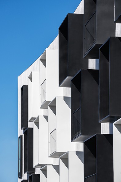 Yapının kimliğini sağlayan balkon ve pencere çerçeveleri binanın geometrik nizamını genişletmek için dışa doğru uzanım göstermekte. Yapıyı sadeleştiren beyaz cepheye, siyah çıkıntılı çerçeveler de ritim katmıştır. Gün boyunca siyah çerçevenin beyaz ciltli yapıya kattığı gölgelikler projeyi hareketlendirip sürekli bir yenilik sağlamıştır.