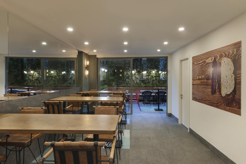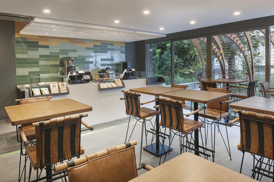 İçeri doğru girdiğinizde renkli seramiklerle kurgulanmış ve metal mesh asma tavan ile vurgulanmış uzun bir koridor size kafenin atmosferini yaşatmaya başlıyor ve en arkada sürpriz bir mekanın olduğunu hissediyorsunuz. Zamanı kısıtlı olanlar için de aldığınız ürünleri hızlıca yiyip çıkabilmeniz için banko karşısında yüksek oturma alanları düzenlenmiştir.