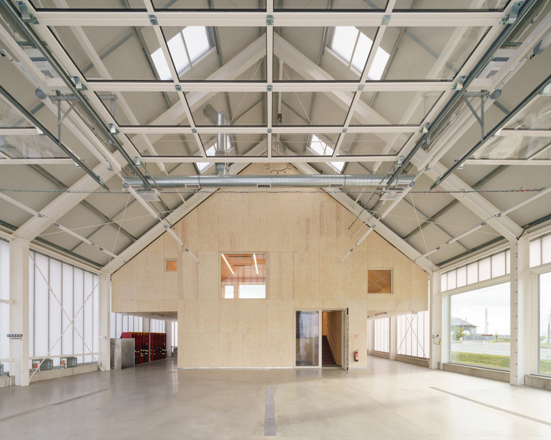 İtfaiye istasyonunun iç kısmında kullanılan masif ahşap yapı, dış cephenin hafif ve şeffaf özellikleriyle zıtlık oluşturuyor. CLT panelleriyle inşa edilen yapının garaj tarafı, ahşap elyaf levhalarla yalıtılmış ve çam kontrplak ile kaplanmış. Bu malzeme kontrastı, estetik ve fonksiyonel bir denge yaratıyor.