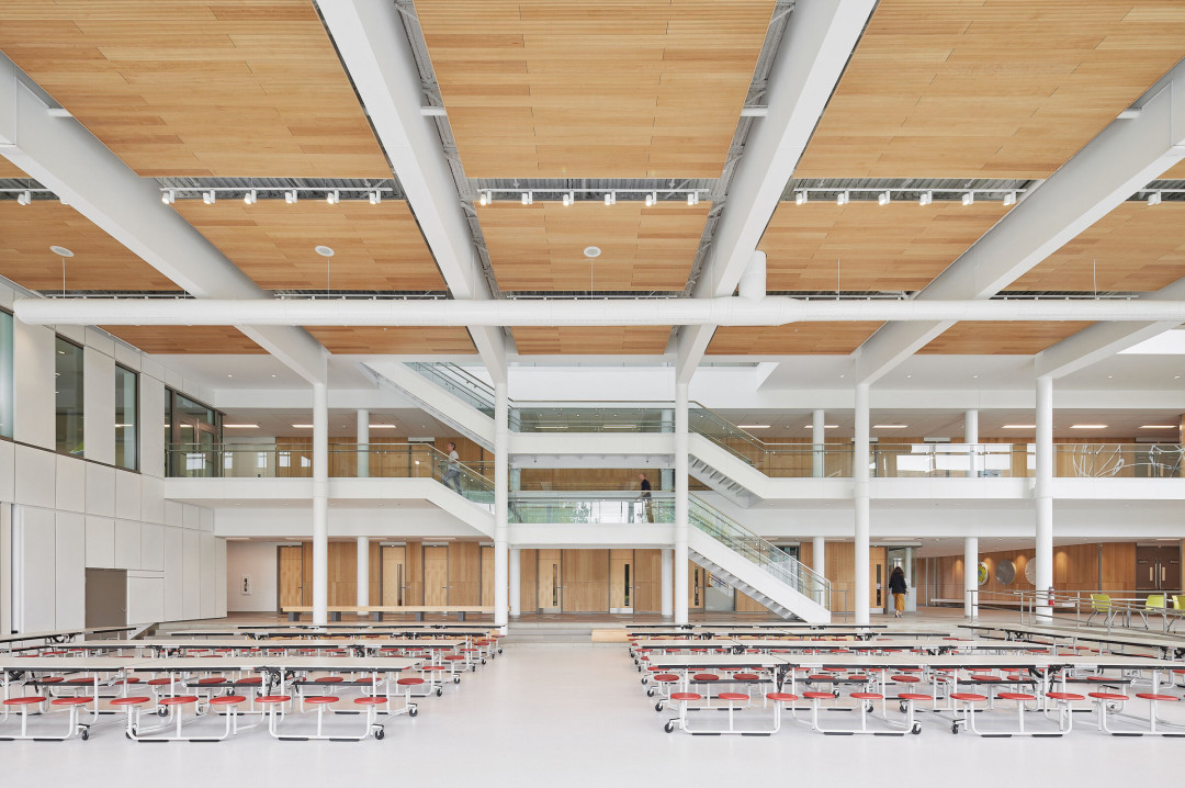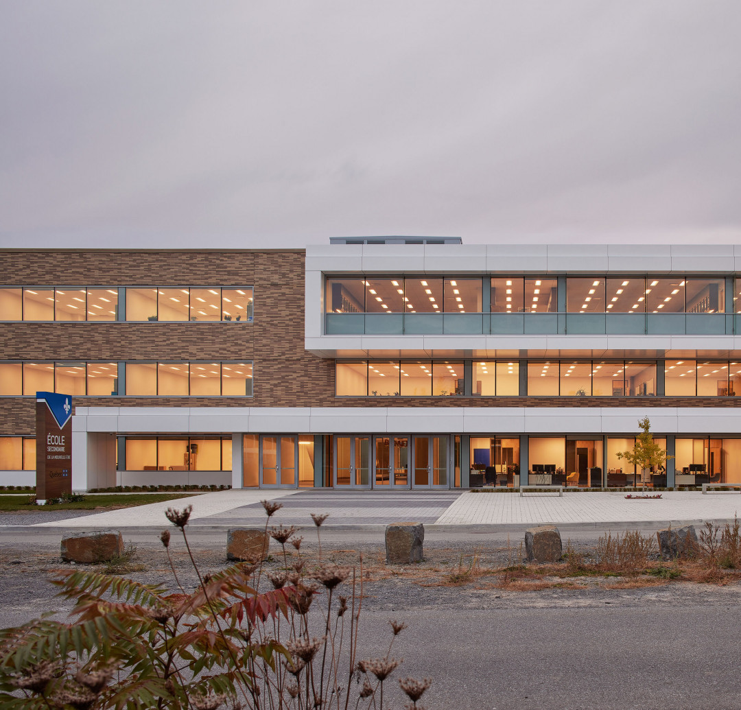 Birtz Bastien Beaudoin Laforest (BBBL) ve Jodoin Lamarre Pratte architectes, Kanada’nın Quebec eyaletinin güneybatısında yer alan Gatineau şehrinde École secondaire de la Nouvelle-Ère'yi (Yeni Dönem Lisesi) tamamladı. Okulun tasarımında doğal ışık, açık alanlar ve sıcak malzemeler ön planda tutulmuş, bu da öğrenmeyi, yaratıcılığı ve konforu destekleyen bir ortam yaratmış. Özellikle aydınlık, çift kat yüksekliğindeki avlu, okulun canlı bir etkinlik merkezi olarak öne çıkıyor.