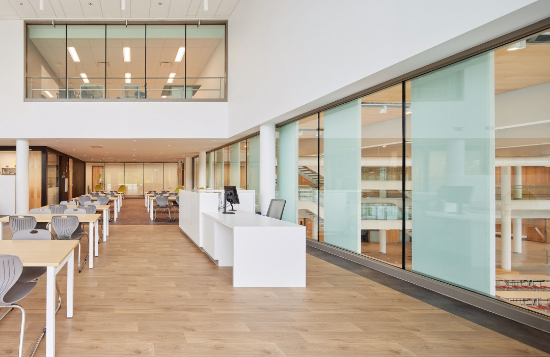 Okulun ana etkinlik merkezi, ana yapının içinde yer alan çift kat yüksekliğindeki avlu ve kafeterya olarak belirlenmiş. Bu geniş ve aydınlık alan, sınıflara, kütüphaneye ve çatı terasına açılan geniş bir merdiven ve koridorla çevrelenmiş. Avlu, arka avluya açılıyor ve kenarındaki banklar bir amfi tiyatro havası yaratıyor. BBBL ve Jodoin Lamarre Pratte architectes, bu avluyu Antik Yunan'da merkezi bir kamusal alan olan “agora”ya benzetiyor ve “çok amaçlı, ışık dolu bir buluşma alanı” olarak tanımlıyor.
