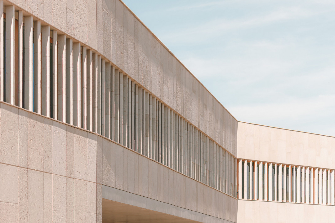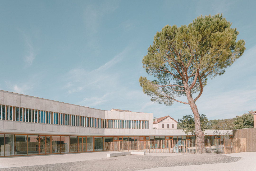 Zemin kattaki sınıflar ve kantinlerin tamamı, okul bahçesine açılan ve bol miktarda doğal ışık girişine izin veren meşe ahşap çerçeveli tam boy camlı cephelere sahip. Cam kapılar ayrıca bu alanlardan dışarıya doğrudan erişim sağlar. Buradaki cephe, yukarıdaki zemin ve çatıdan doğal gölgeleme için geri çekilmiş. Üst katta, cephede yine ahşapla çerçevelenmiş ve güney güneşinden taştan ince lameller ile korunan büyük pencerelerden oluşan bir bant bulunur. Lameller, aksi takdirde yatay olan projeye dikeylik unsuru ve taş kaplamanın derzleriyle tamamlanan görsel bir doku kazandırıyor.