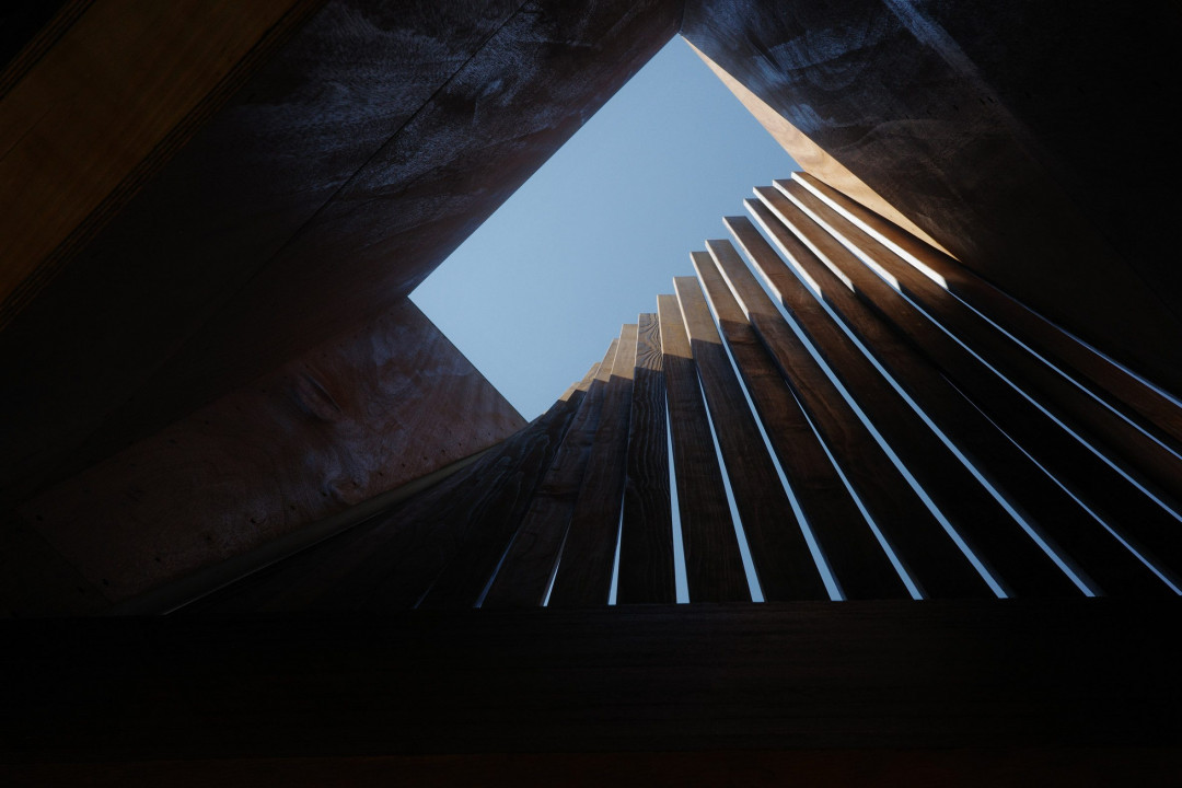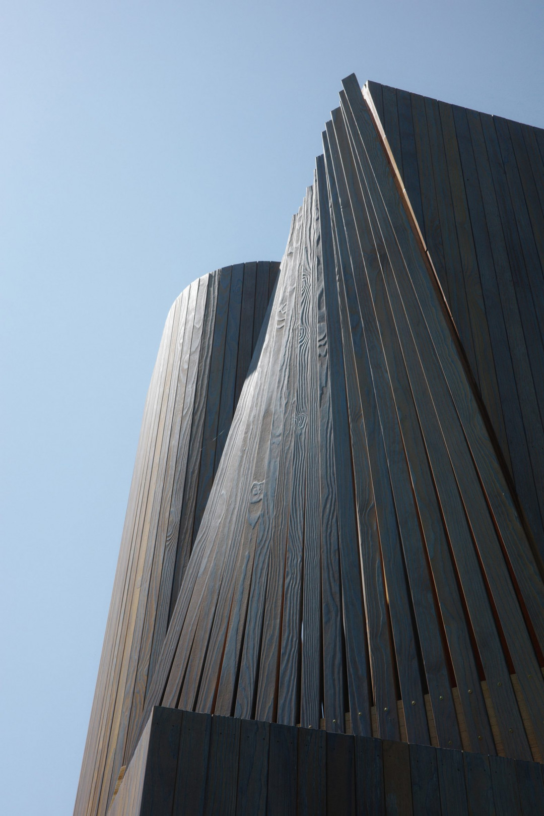 Young Projects'in tasarladığı pavyon, dik açılarla birleşen bir taban üzerine inşa edilmiş ve üst kısımdaki yelpaze benzeri ahşap çıtaların oluşturduğu açılmış yüzeylerle dikkat çekiyor. Çam ağacından yapılan bu katmanlar rüzgarla birlikte hareket ediyor. Böylece, yapı hem gökyüzü ve ağaç manzarasını hem de çevresindeki doğal dokuları çam kaplamanın belirgin yüzeyiyle harmanlıyor.