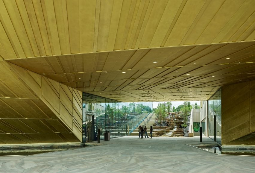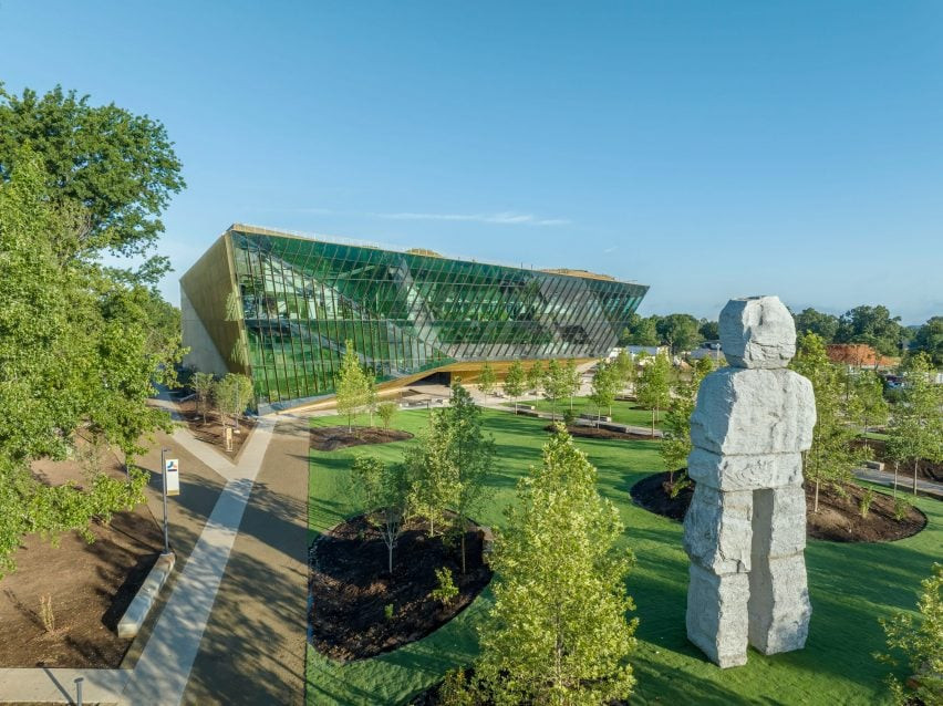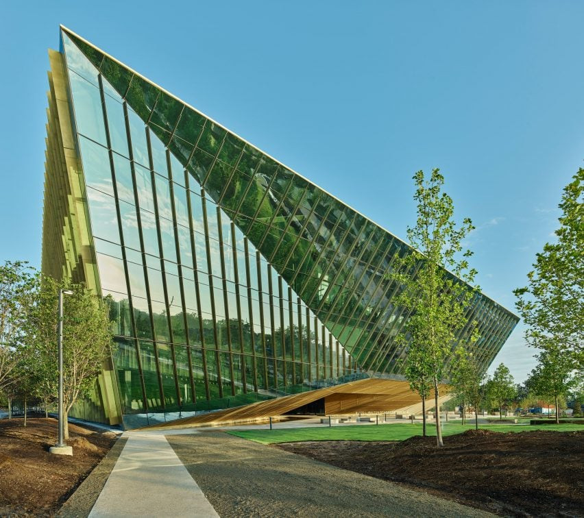New York merkezli OSD (Office of Strategy + Design) iş birliğiyle tasarlanan binada, Ozark Dağları’nın kireç taşı uçurumlarını andıran açılı cepheler, içe doğru eğilen cam yüzeyler ve çarpıcı bir konsol giriş bulunuyor. Yapının cephesi bronz tonlu pirinç, beton ve cam panellerle şekillendirilmiş.