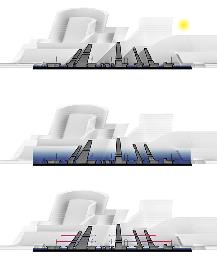 Ayrıca, duvarların eğrisel kırınımları, rüzgarları engelleyerek, belirli alanlardaki rahatsız eden rüzgâr koridorlarını önlüyor. Benzer şekilde, delikli duvarlar, esintinin tesisattan geçmesine ve boşlukları soğutmasına izin veriyor. Tanklardan ve su yollarında akan su, iç mekanlardaki sıcaklıkları düşürerek bir mikro iklim yaratıyor.