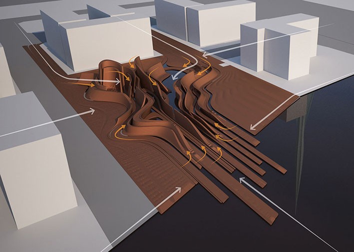 Land-Mark tasarımcıları, insanların kamusal alanın çevresindeki odak noktaları olan binalardan kamusal alanın iç mekanlarına erişilebilecek çeşitli giriş noktaları oluşturdu. Ziyaretçiler, kıvrımlı yürüyüş yollarına eşlik eden su kütleleri ile çeşitli alanlara bağlanabiliyor. Güney girişi, insanların vakit geçirebileceği bir gölete bağlanırken, batı cephesindeki giriş bulundurduğu payandalar sayesinde kullanıcıları denizin küçük bir uzantılarına götürüyor. Bu şekilde kullanıcıların alan içerisindeki denizi deneyimlemesi sağlanıyor.