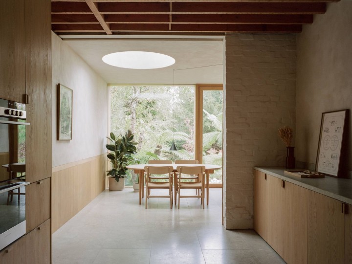 Düşük enerjili ev, arazinin eğimli topografyasına incelikle entegre edilerek su manzarası sağlıyor ve yaşam ve çalışma alanlarının sınırlarını belirliyor. Tamamlanan ilk ev, eğimli araziden tam olarak yararlanarak geniş bir sosyal alana inen açık plan mutfak ve yaşam alanı ile benzersiz bir Z-şekilli plan sergiliyor. Evin özelliği, düzensiz ahşap çıtalar ve ince metal unsurlar içeren doğal malzemelerin kullanımıyla manzara ile iç içe geçmesi.