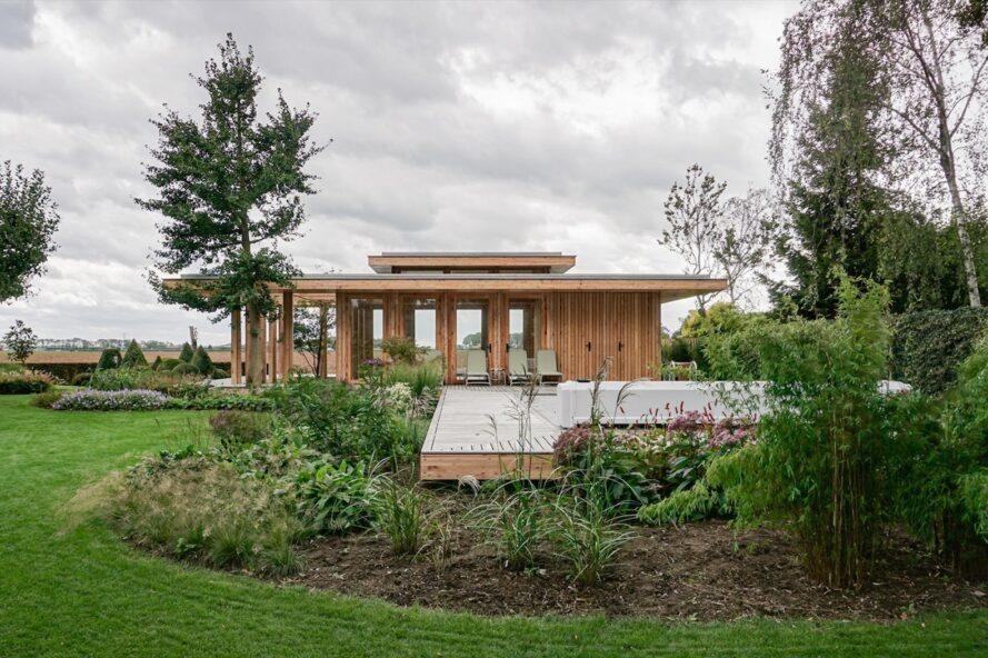 İç ve dış mekânlar arasındaki sınırı ortadan kaldırmak için, ev ile manzara arasına geniş bir veranda tasarlanmış. Dış yaşam alanı, 54 m2 olan ev alanını 210 m2'‘ye kadar genişletiyor. Veranda, her yöne uzanan tarım arazileri arasında bir sınır görevi gören bir bahçe ve mevcut bir hendek üzerine monte edilmiş. Bahçe, sedum kaplı çatıdan toplanan yağmur suyu ile sulanmakta.
