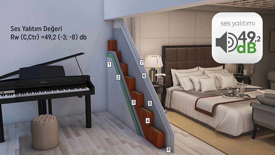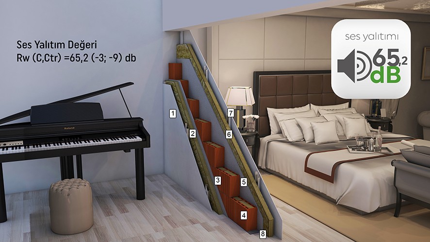 1- Alçıpan Plaka, 2- Alçı Levha Profili Sistem + Taş Yünü, 3- Kaba Sıva, 4- Ekoklinker 12, 5- Kaba Sıva, 6- Alçı Levha Profili Sistem + Taş Yünü, 7- Alçıpan Plaka, 8- DKM Fonostrip Akustik Şerit