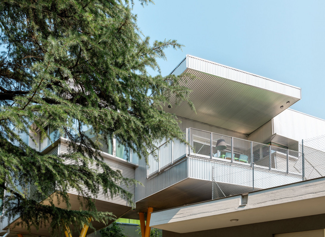 Galvanizli çelikten prefabrik bir konut olan ve oluklu alüminyum kaplamayla kaplanan eklenti, ışığı ve rengi eğlenceli bir şekilde yansıtıyor. Öncelikle uzun çatallı metal sütunlar üzerine oturtularak, 1970'lerin orijinal beton yapısından minimum destek alınması sağlanmış. ELASTICOFarm, "Hem dış cephe kaplaması hem de iç duvarlar kuru yöntemler kullanılarak inşa edildi. Poliüretan sprey yalıtım uygulaması binanın yüksek enerji verimliliğine önemli ölçüde katkıda bulunuyor." dedi.