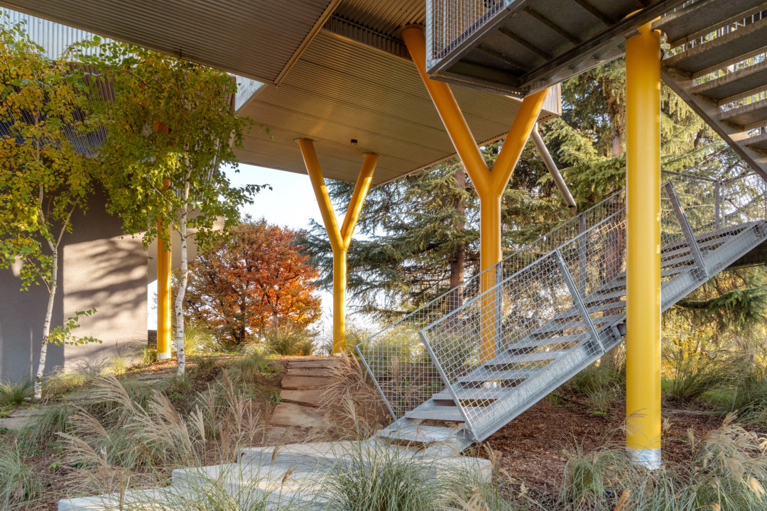 Eve kullanışlı metal bir merdivenle ulaşılıyor; açık ve asma tasarımı, konut sakinleri ve ziyaretçiler girişe doğru çıkarken parkın manzarasını sunuyor. İçeri girildiğinde boş avlu ve avlunun boşluğuna uzanan üç huş ağacı görülüyor.