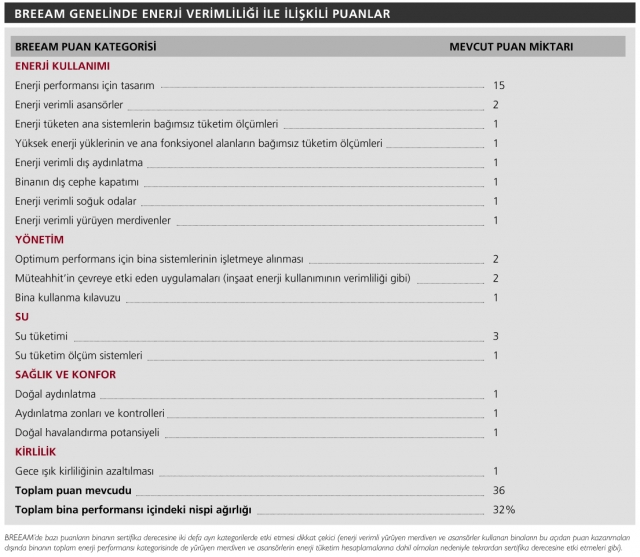 BREEAM ve LEED standartlarının tüm kısımlarındaki puanlar analiz edildiği zaman enerji verimliliğine yönelik uygulamaların aşağıdaki kategorilerde toplandığını görmekteyiz:
