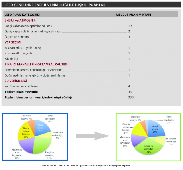Öte yandan LEED 2009 standardının tüm versiyonları için referans bir binaya göre %10’luk bir enerji verimliliği bir ön koşul ve binalar ancak %12’lik bir enerji tasarrufuna ulaştıktan sonra puan kazanmaya layık görülmekte. Bu ön koşulu enerji verimliliğinin LEED standardının vazgeçilmez bir parçası olduğu şeklinde de yorumlamak mümkün. Zira LEED standardının aksine, BREEAM (Europe Commercial 2009) standardının şu anki versiyonunda böyle bir ön koşul bulunmamakta ve binalar BREEAM standardı altında %11’lik bir enerji verimliliği ile doğrudan 5 puan kazanabilmekte. Bu BREEAM standardını seçen bina sahiplerine potensiyel olarak enerji verimliliği alanında kaybedilen puanları diğer alanlarda kazanılabilecek puanlarla telafi etme imkanını sağlanmakta.
