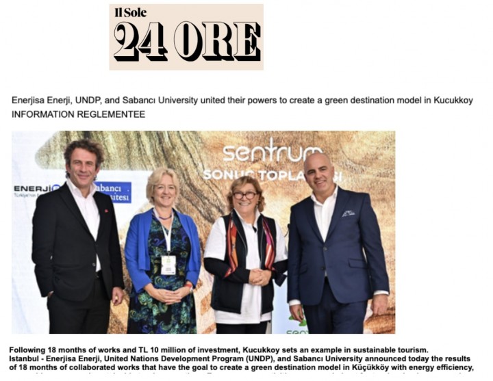 18 ay süren sürdürülebilir enerji temelli turizm uygulamaları ve sonuçları; Sabancı Holding Yönetim Kurulu Başkanı ve Sabancı Üniversitesi Kurucu Mütevelli Heyeti Başkanı Güler Sabancı, Sabancı Holding Enerji Grubu Başkanı ve Enerjisa Enerji Yönetim Kurulu Başkanı Kıvanç Zaimler ve UNDP Türkiye Mukim Temsilcisi Louisa Vinton’ın katılımlarıyla gerçekleştirilen basın toplantısında paylaşıldı.