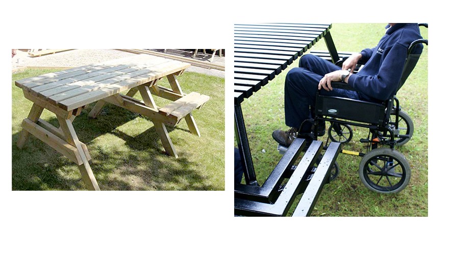 Erişilebilir bir piknik masası, tekerlekli sandalyede bulunan bir kişinin açık hava toplantılarına katılımını sağlar. Masanın oturma kısmında tekerlekli sandalyeye ayrılmış boş kısım kullanıcıların ayrıştırılmadan bir arada olmalarını sağlar.