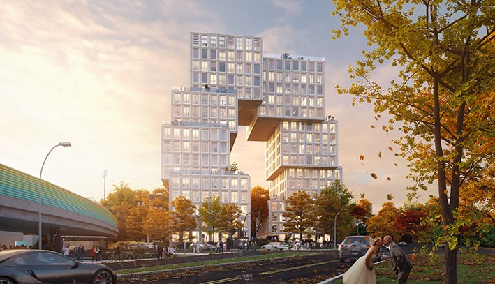 MVRDV, Münih'in güneyinde yollarla çevrili zorlu bir alanda yer alan bir bina kompleksinin yenilenmesini projesini duyurdu. Mevcut dokuz bloktan oluşan bina kompleksine iki basamaklı kulelerin eklenmesiyle tasarlanan yeni proje ile mevcut yapılanma genişletiliyor ve bölgenin merkezine yeşil bir plaza konumlandırılırken mahalle için de yeni bir çekim noktası yaratılıyor.