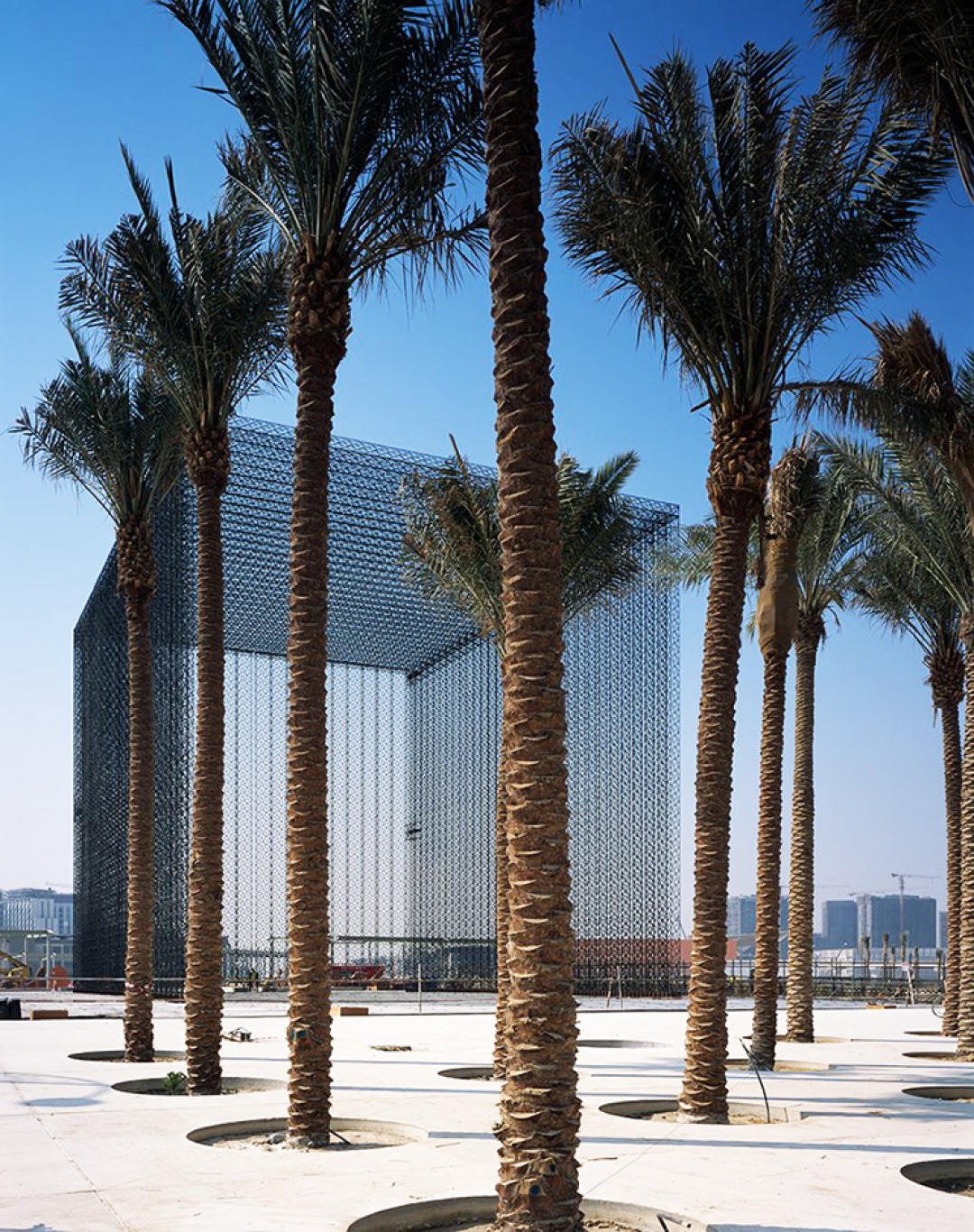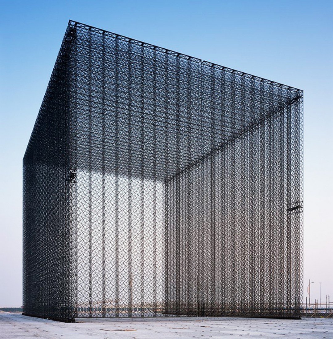 Gelen ilk görüntülerde Asif Khan’ın, expo 2020 dubai giriş portalları için bölge genelinde ışık ve hava akışını düzenlemek için kullanılan karmaşık bir tasarım olan geleneksel mashrabiya'nın fütüristik bir uyarlamasını sunduğunu görüyoruz. Birbirlerine birer dantel motifi gibi bağlanan siyah renkli küpler, yakından bakıldıkça daha fazla ışık veren gizemli, karanlık boşluklar yaratıyor. Gökyüzünde oldukça detaylı bir duvar resmi gibi görünen kapıların fuar alanına yansıyan gölgesi de misafirleri, ilhamını yerel kaynaklardan almış eğlenceli bir mimari anlayışıyla karşılıyor.