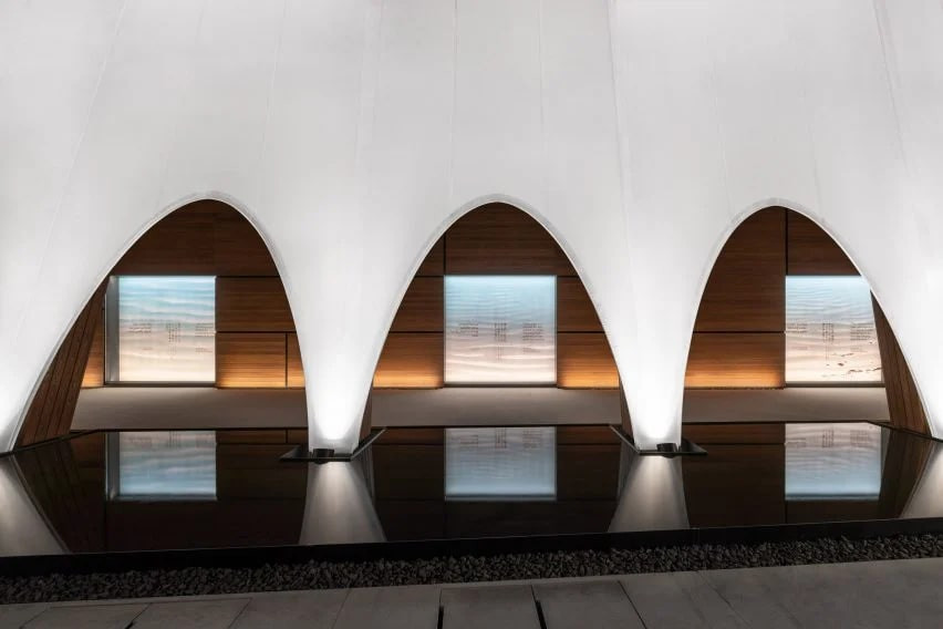 Pavyonun temelini oluşturan kıvrımlı ahşap yapı, Katar ve Japon marangozluk teknikleri ile inşa edilmiş. Üzeri gerilen beyaz kumaş ise hem işlevsel hem de sembolik bir cephe oluşturuyor; dhov yelkenlilerini andıran bu tasarım, Katar’ın denizle kurduğu bağı simgeliyor.