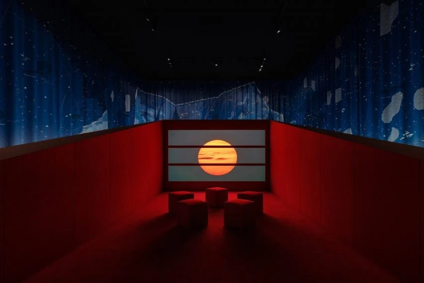 Ekranı çevreleyen bölme duvarları ise çöl kumullarını taklit edecek şekilde tasarlanmış. Böylece izleyiciye, serginin kalabalığından izole bir sığınak hissi sunuluyor. Bantal, bu alanın ilham kaynağını şöyle açıklıyor: “Birçok Katar’lının şehirden uzaklaşmak için gittiği kış kamplarını referans aldık. Geometrik olarak yorumladığımız bu çöl yapısının içinde, kıyı şeridinin çabalarından uzak bir sinema alanı yarattık.”