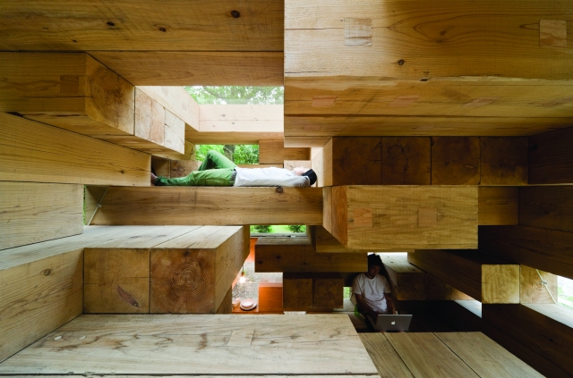 Projelerde tercih edilme sebebi incelendiğinde kereste ile ilgili sürekli aynı sonuca ulaşılıyor; bir inşa materyali olarak pek çok farklı alanda pek çok farklı görevle kullanılabiliyor olması. Sütunlar, dış cephe duvarları, iç cephe duvarları, tavanlar, zemin, kaplamalar, merdivenler, pencere çerçeveleri… SFA’nın büyük ve kaba parçalar halinde kullanmayı tercih ettiği keresteler, sıcak ve doğal bir ortam yaratmanın ötesinde çağdaş bir görüntü de yakalamış.