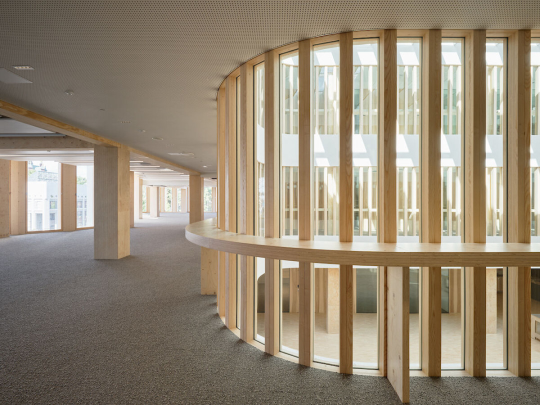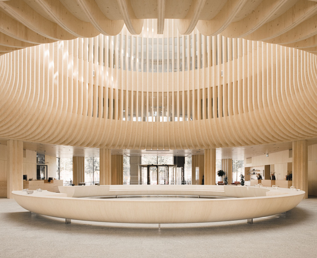 Binanın yapısal sistemi ve iç mekanlarının tasarımı, maksimum esneklik ve uyarlanabilirlik sağlıyor, böylece uzun ömürlülüğü teşvik ediyor. Ahşabın doğal güzelliğini sergileyen açık ladin yapılar ile özenli ladin ve kızılağaç detayları, iç mekanın estetiğini artırıyor. Bina merkezindeki etkileyici hol, heykelsi yuvarlak bir tavan penceresi ve büyük bir dairesel ahşap bank ile dikkat çekiyor.