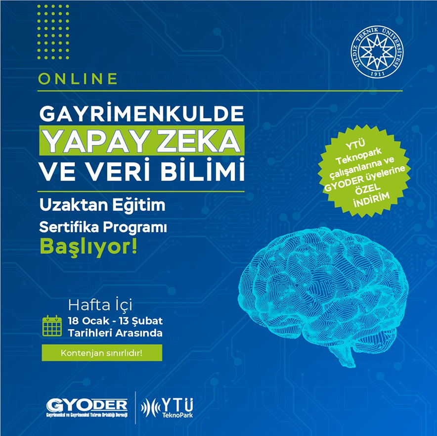 Gayrimenkul ve Gayrimenkul Yatırım Ortaklığı Derneği (GYODER) ile Yıldız Teknik Üniversitesi (YTÜ) Teknopark iş birliği ile başlayacak ‘Gayrimenkulde Yapay Zekâ ve Veri Bilimi’ programı, Türkiye’de bu alanda düzenlenecek ilk sertifika programı olacak. Bu yenilikçi uzaktan eğitim sertifika programına katılanlar, gayrimenkul teknolojisinde kullanılan ‘yapay zekâ’, ‘makine öğrenimi’ ve ‘veri biliminde ortaya çıkan teknolojiler’ hakkında bilgi sahibi olacak.