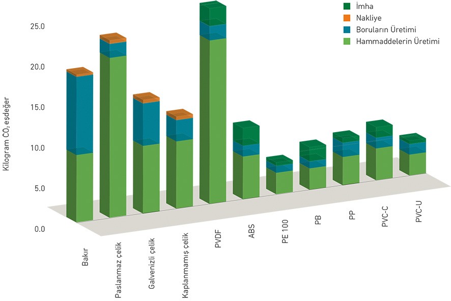 Yapılan bu çalışma için hazırlanan aşağıdaki grafikte, termoplastik boru sistemlerinin çevre performansının kalitesi, yapı teknolojisi, sanayi, su ve gaz dağıtım alanlarındaki uygulamaları için ömürleri değerlendirilerek gösterilmektedir. (Analizde, yaygın olarak kullanılan plastiklerin her biri için bir metre uzunluğundaki borunun çevreye olan etkisi, ana rakip malzemelerle (DN25, 80, 150 ve 400) karşılaştırılmıştır).