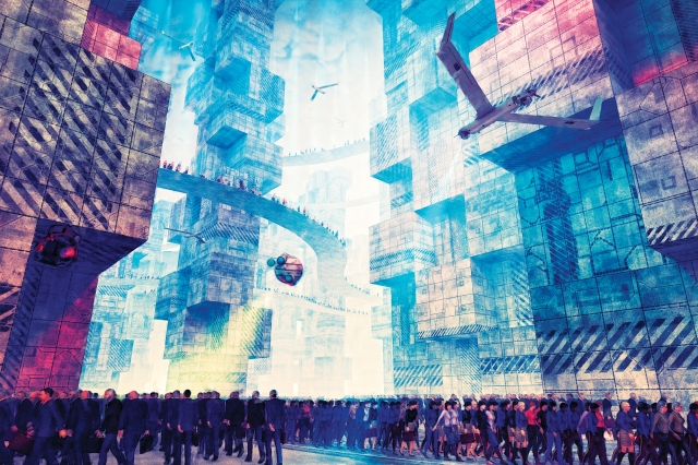 “Dijitalize olmuş yüksek yapılar, farklı kotlardaki yollar ile birbirleri ile bağlantılı ancak zemindeki yoğun kentli ile bağlantısı olmayan bir fütüristik kent görseli…. Üzerine düşünmek gerekli, belki de bu yaşam ile günümüz arasında çok da fazla zaman kalmadı…”