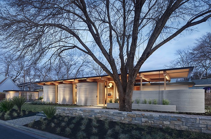Her şeyden önce dokuların ve oranların oyununa dayanan, eklemlenmesinde abartısız kalan cephe tasarımı; oluklu beton mimari kütleler, ahşap elemanlar ve kanopiler ile tamamlanıyor. Lake|Flato Associate Ashley Heeren, “3D baskılı beton ve kavisli duvarların organik doğası bizim için yeni tasarım dilleri olsa da House Zero hala mimarimizde aradığımız doğal bağlantılarla tamamen uyumluydu. Sıfır ev, tamamen yeni bir inşa yöntemiyle inşa edilmiş davetkar ve konforlu bir aile evinde zanaat ve performans için ortak tutkularımızı ifade ediyor. Ekibimiz için böyle yenilikçi bir ev tasarımı üzerinde ICON ile çalışmak ve ev inşasının geleceğinin bir parçası olmak heyecan vericiydi." diyor.