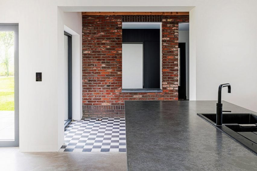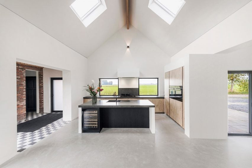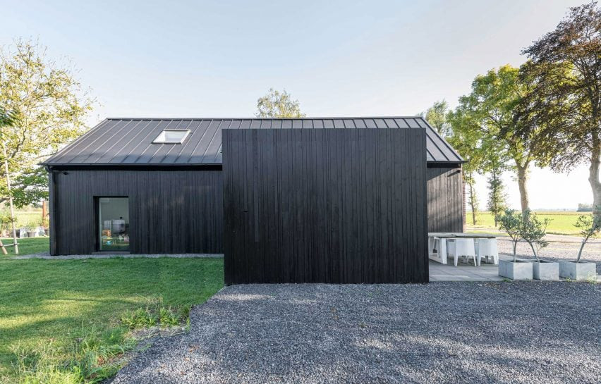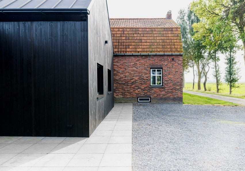 Hilversum merkezli mimarlık ofisi, bu yeni yapıyı siyah boyalı ahşap kaplama ile tasarlayarak, hem bölgede yaygın olan tarımsal yapı tipolojisine gönderme yapıyor hem de bu hacmi, çiftlik evinin adeta soyut bir gölgesi gibi konumlandırıyor.