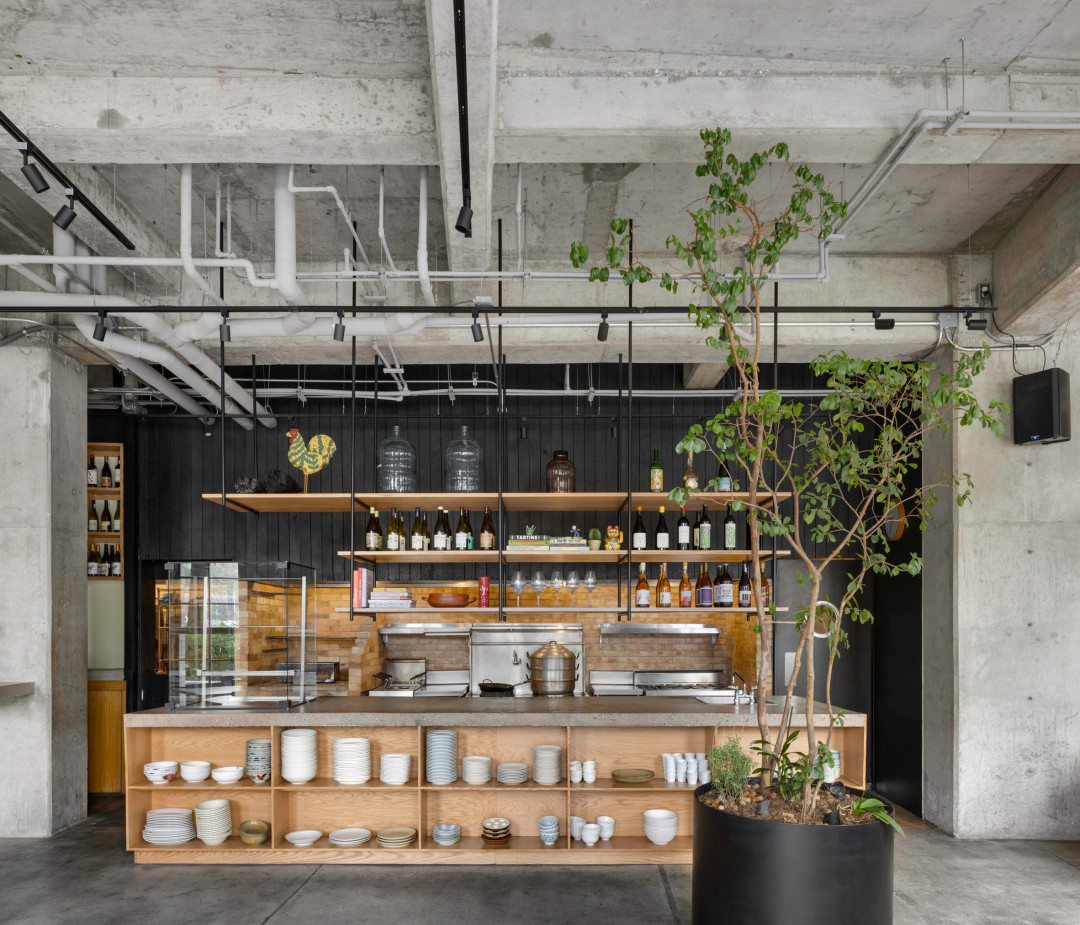 Bar tezgâhının üzerinde ve açık mutfak servis alanında, düzenli bir şekilde açık raflar asılmış. Restoran genelinde ise büyük ve küçük saksılar, mekâna doğal bir bitki örtüsü katıyor, böylece iç mekânda taze ve canlı bir atmosfer yaratılıyor. Genel olarak, yüksek tavanlar, büyük pencereler ve açık mutfak, hafif ve ferah bir atmosfer yaratıyor, malzemeler ise endüstriyel bir hava katıyor.