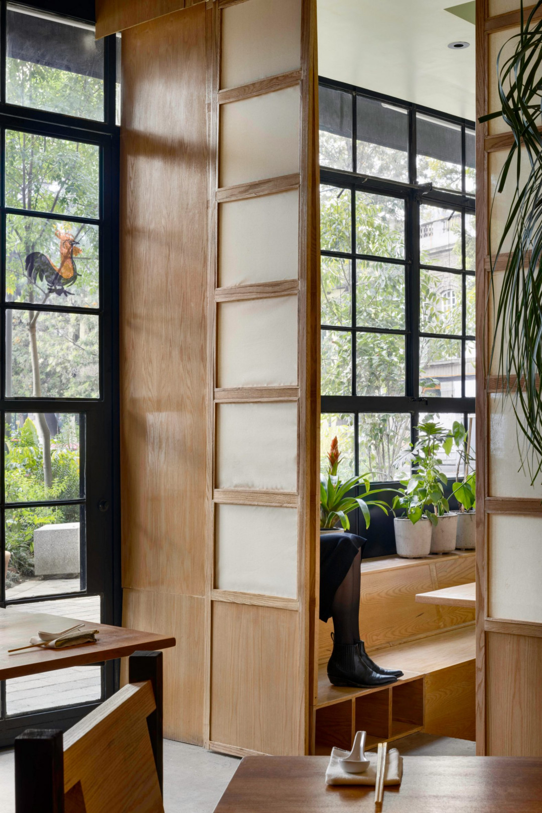 Özel yemek odaları kaydırılabilir kağıt perdelerin arkasında gizlenmiş. Serbest duran masalar ve sandalyeler, mekânın etrafındaki köşe alanlarında eklenmiş olup, büyük gruplar için köşeye yerleştirilmiş kavisli bir üniteyi de kapsıyor. Banketlerin üstündeki raflar, şarap şişeleri, cam eşyalar ve çeşitli aksesuarlarla düzenli bir şekilde dolmuş durumda. Bu açık raflar, restoranın estetik bir görünüm kazanmasına katkıda bulunurken, aynı zamanda kullanım kolaylığı sağlıyor. Ayrıca, iki servis tezgâhının üzerinde askıya alınmış açık depolama üniteleri bulunuyor. Bu üniteler, servis esnasında ihtiyaç duyulan malzemeleri erişilebilir bir şekilde sunarak hem işlevselliği artırıyor hem de mekânın düzenini koruyor.