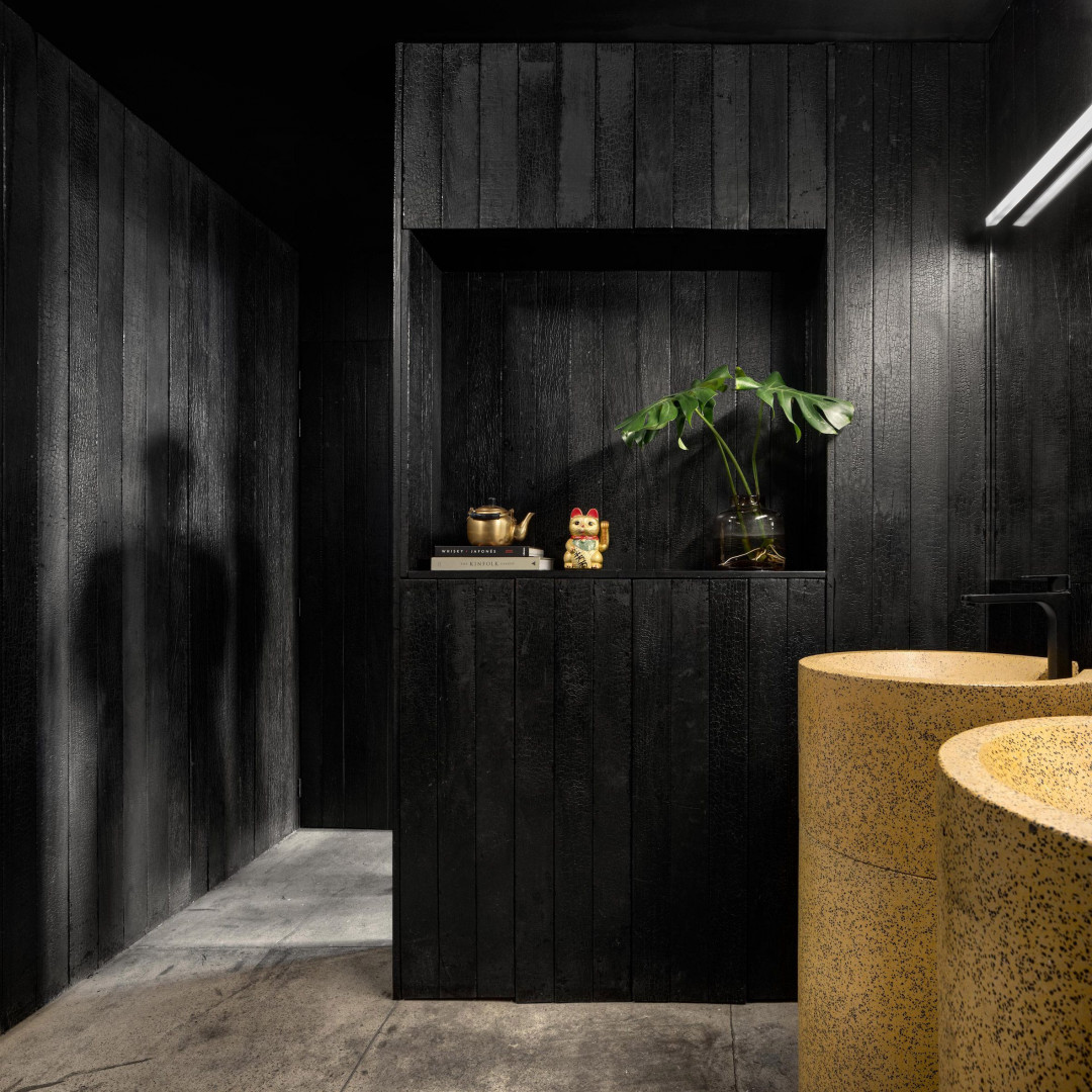 Barın arkasında, açık mutfakta ve banyo duvarlarında, kömürleşmiş siyah kaplamayla kaplı dikey ahşap paneller kullanılmış. Bu detaylar, mekâna şık ve modern bir dokunuş katarken, aynı zamanda derinlik ve kontrast yaratıyor.