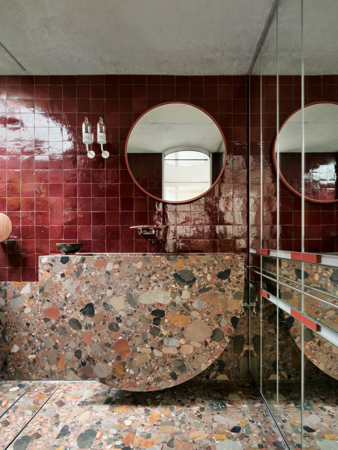 Çeşitli uzunluklarda kesilmiş soluk tuğlalar, caddeye bakan cephe boyunca düzgün bir şekilde dizilerek bir dizi benzersiz şekilli pencereyi çerçeveliyor. Duvarın alt kısmına doğru, L şeklindeki bir bölüm, komşu tarihi binaların kum taşı tabanlarına benzemesi amaçlanan kırık, geri kazanılmış tuğlalarla kaplanmış.