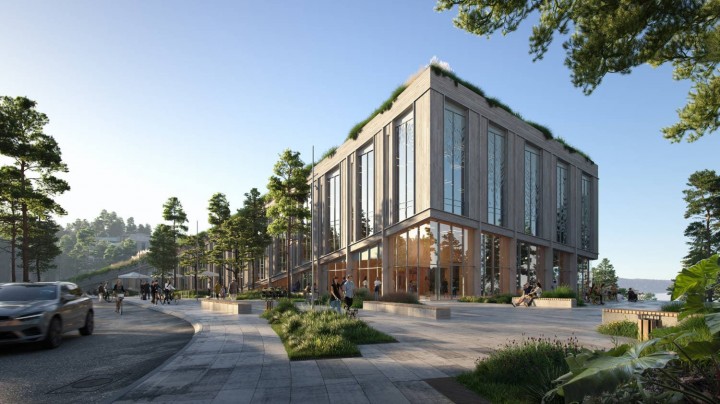 Çevre dostu tatil evi, 45 derece döndürülmüş iki kare hacimden oluşuyor ve bu hacimler iki katlı olarak yükseliyor. Metal çatılar, binanın görsel ifadesine katkı sağlarken, yapı doğayla uyum içinde yer alıyor.