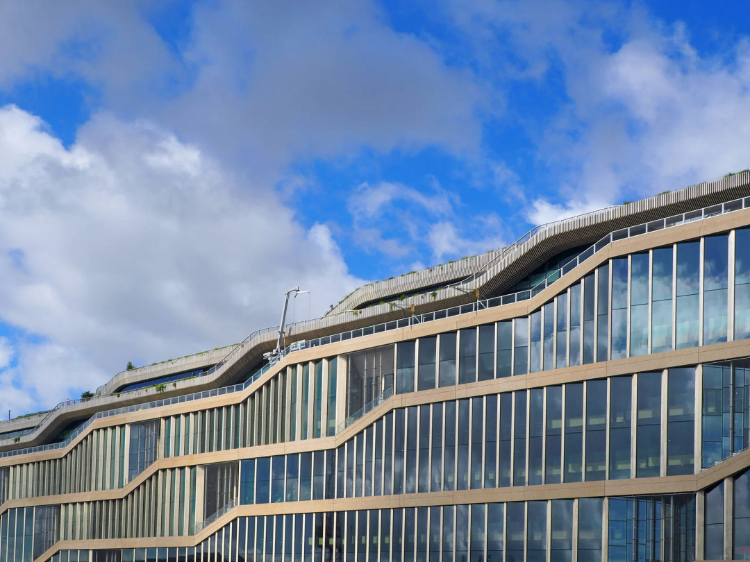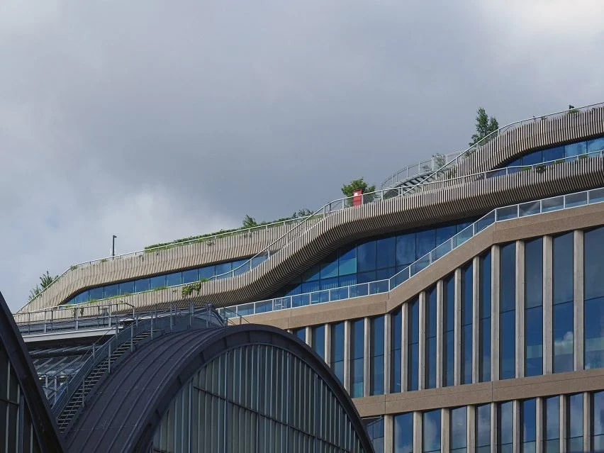 Bina, sadece yatay uzunluğu ile değil, peyzajlı çatı terasları ve koşu parkuru gibi kullanıcı odaklı detaylarıyla da dikkat çekiyor. Çatı bahçeleri, yapıdan dışa taşarak hem yeşil alan hem de sosyal alan olarak kurgulanmış.
