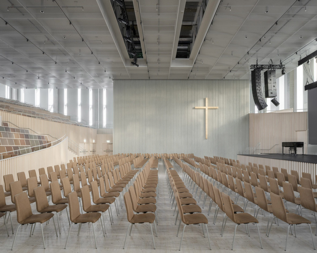 Kilisenin ana salonu, eğrisel ahşap bölücülerle tanımlanan oturma alanlarına sahip olup, doğal ahşap ve beyaz duvarlardan oluşan bir paletle tasarlanmış. Salon, toprak tonlarındaki kahverengi ve yeşil oturma alanlarıyla tamamlanmış. Salonda, açık bir zemin ve sabit oturma alanları bulunuyor.