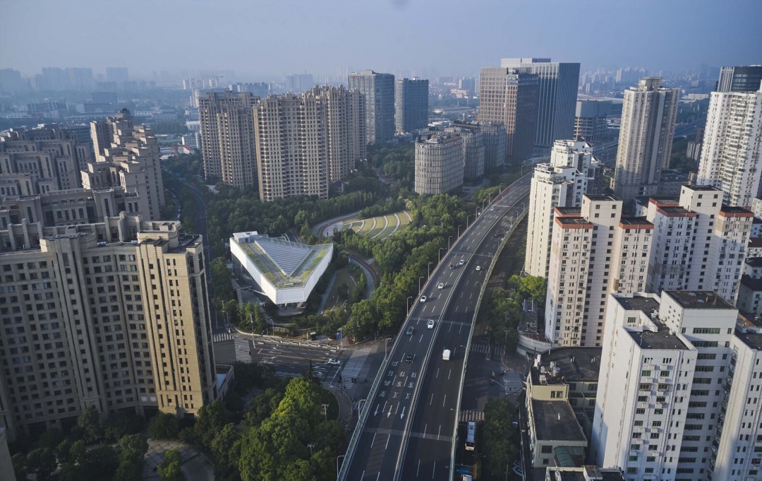 Yapı sitenin doğu tarafında, Metro Hattı 1'in işgal edilen alanından ve yükseltilmiş yollardan uzakta yer alıyor. Mühendislik açısından bu yerleşim inşaat karmaşıklığını azaltır ve metrolar ve üst geçitlerden kaynaklanabilecek temel çökmesi riskini ortadan kaldırıyor. Kentsel bir bakış açısından sitenin batı tarafındaki yeşil kuşağın birliği korunarak, yeşilliklerle çevrili bir sanat merkezi yaratılmış. Şanghay'ın Güney Tren İstasyonu iş bölgesinden kıvrılan ve Metro Hattı 1 ile altı çizilen pitoresk bulvar, Xuhui CBD Central Park'ın bel kemiğini oluşturuyor. Bu peyzaj ekseninden, binanın içine ve dışına nüfuz eden üç boyutlu yaya erişimi geliştirildi. Üç boyutlu yaya trafiği peyzajların, mimari alanların ve mimari formların merkezi haline geldi.