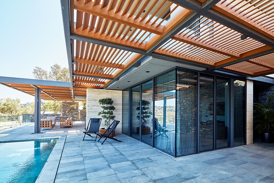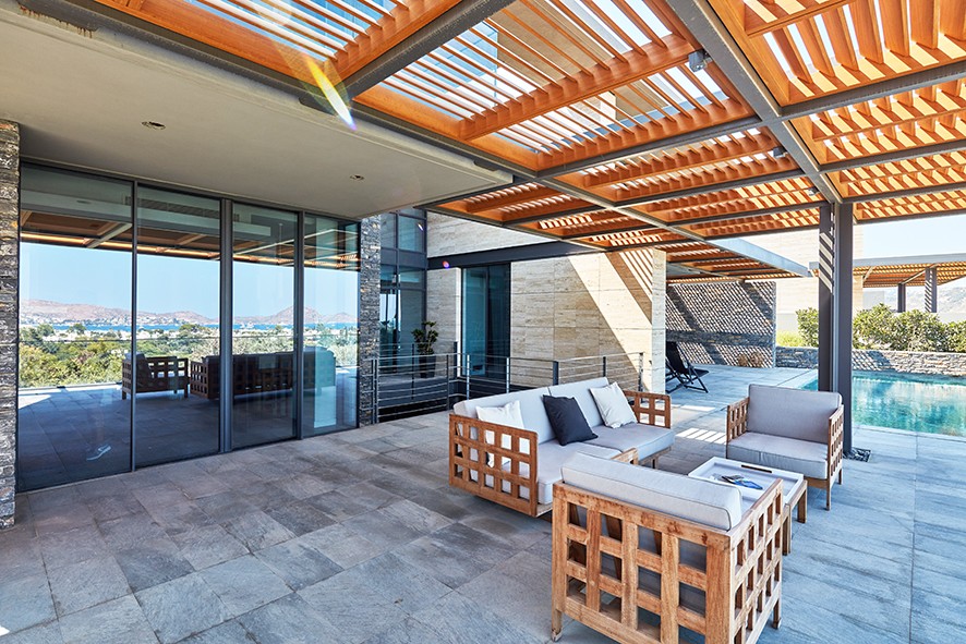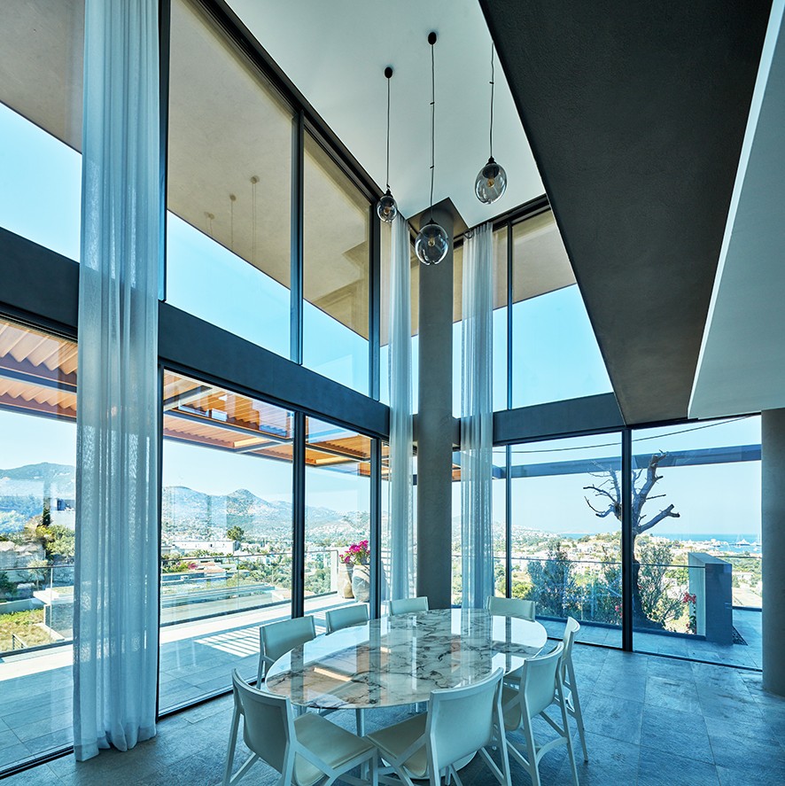 Yalıkavak’ın kayalık tepelerinden birinde konumlandırılan projenin arazisi, zeytin ağaçları ve yerel bitki örtüsü ile eşsiz bir özelliğe sahip. EAA-Emre Arolat Architecture tarafından bulunduğu eğimli araziye yatay platformlar halinde entegre edilen konutlar, farklı kotlarda konumlandırılarak çatı, tente, teras, balkon, havuz ve güneşlenme alanlarını biçimlendiriyor. Toprak tonları ile renklendirilen ve doku kazandırılan brüt beton, yapının mimarisinde kendine has bir çekim kuvveti yaratırken, Guardian Glass ürünleri ile şekillendirilen ön cephede ise, iç mekan ve dış mekan arasındaki sınır, Guardian SunGuard® High Performance Neutral 50/32 kaplamalı cam ile berraklaştırılarak, içerideki yaşam alanları da yarı açık alanlara dönüştürülüyor.